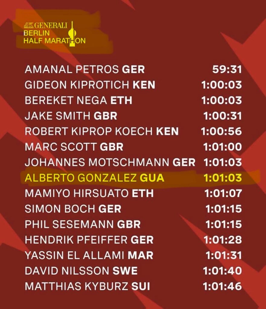 El atleta guatemalteco Alberto González se prepara para una de las citas más importantes de su carrera: participará el próximo 29 de marzo en el medio maratón de Berlín, Alemania, donde figura en el listado élite del evento, confirmando su presencia entre los mejores corredores del mundo en la distancia de 21,097 kilómetros.