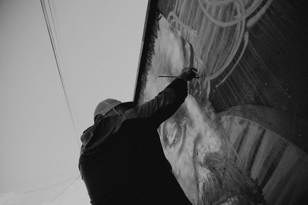 La obra fue realizada sobre una pared previamente intervenida con grafitis, los cuales Yohol decidió integrar al fondo de su composición, dándole una nueva vida al espacio sin borrar por completo su historia visual.
