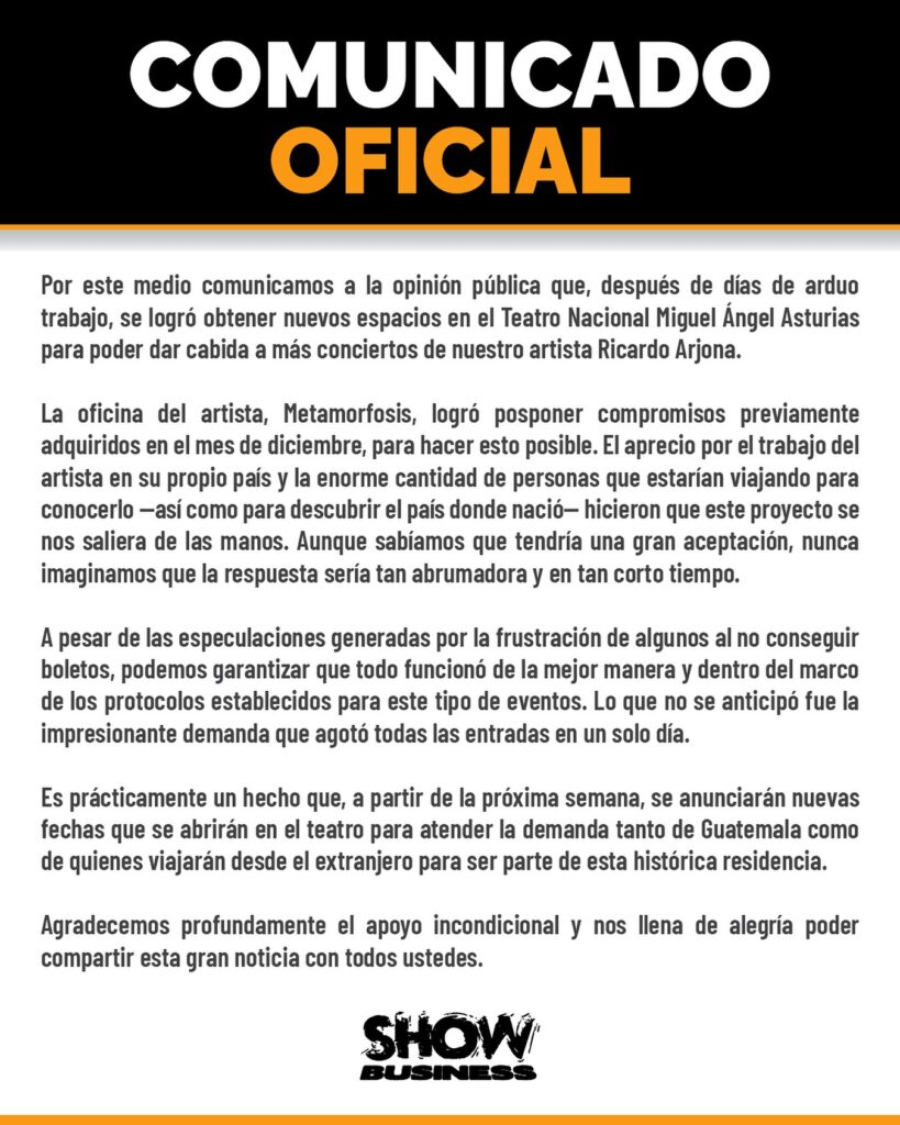 La promotora Show Business Guatemala anunció en los últimos días que se abrirán nuevas fechas para prolongar la residencia de Ricardo Arjona en Guate, luego de que las entradas para sus 15 conciertos se agotaran en menos de tres horas.