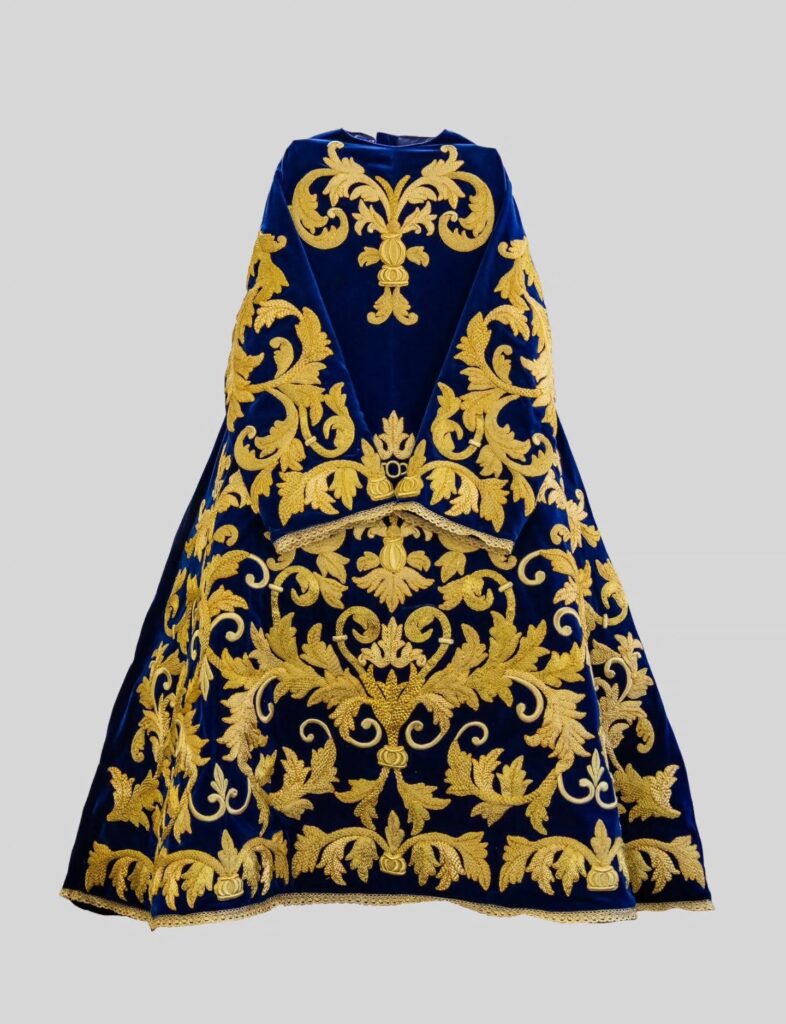 La pieza fue elaborada por Atavío Sagrado y Taller de Bordado María Auxiliadora, ubicado en la ciudad colonial de Antigua. Allí, el bordado no se improvisa. Se estudia el diseño, se trazan los patrones, se seleccionan los materiales y se inicia un proceso que puede tomar semanas, incluso meses. Cada puntada exige exactitud. Cada relieve en hilo dorado debe mantener equilibrio, armonía y coherencia con la iconografía que acompaña la imagen.