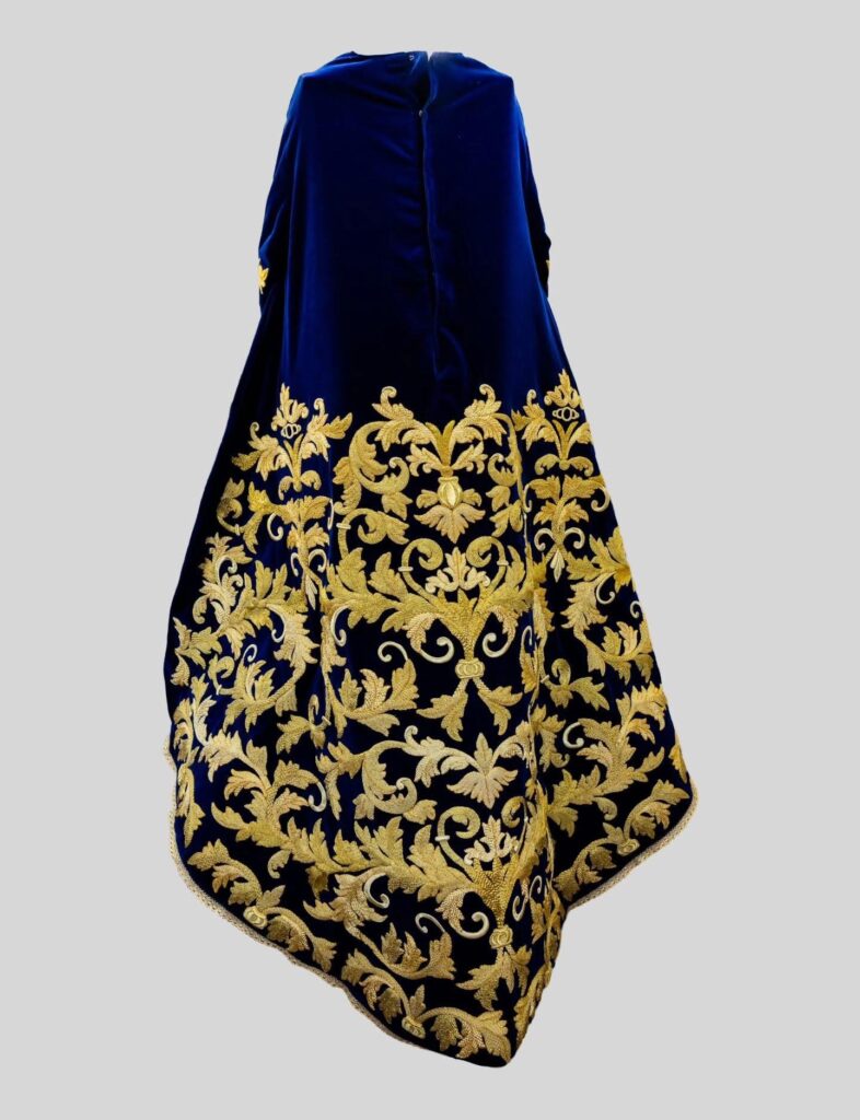 El terciopelo azul profundo sostiene el bordado en oro, generando un contraste sobrio que dialoga con el carácter penitencial del tiempo litúrgico. El diseño responde a una tradición que en Guate ha sido heredada por generaciones: vestir imágenes procesionales con piezas que reflejen solemnidad, arte y respeto.