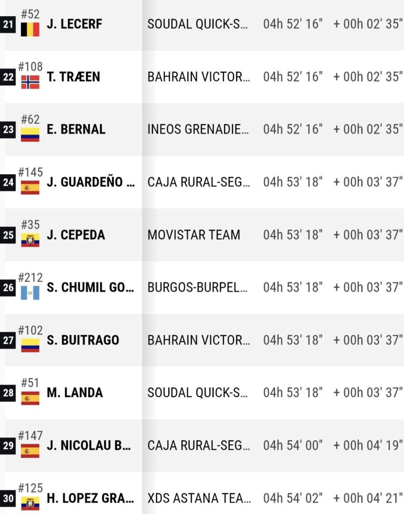 Chumil cerró este viernes la séptima etapa de la llamada también “La Vuelta 2025”. Su tiempo del día fue 04:53:18 horas, a diferencia de 03:37 minutos del ganador, el español Juan Ayuso, quien empleó 04:49:41 horas. El joven guatemalteco se ubicó en el puesto 26.