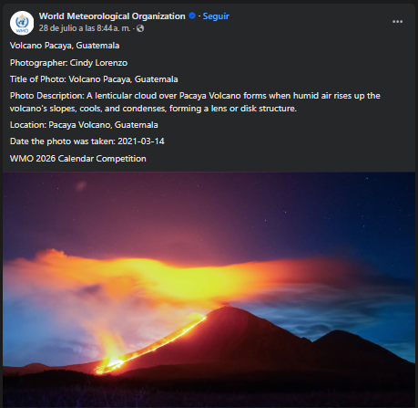 Lorenzo postuló una imagen del volcán de Pacaya, cuyo pico es cubierto por una nube lenticular, la cual “se forma cuando el aire húmedo sube por las laderas del volcán, se enfría y se condensa, formando una estructura de lente o disco“, según indica la descripción de la imagen.