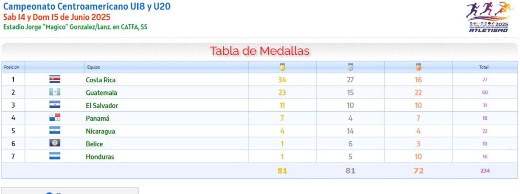Nuestro país tuvo una destacada participación en el Campeonato Centroamericano de Atletismo Sub-18 y Sub-20, al sumar un total de 60 medallas, distribuidas en 23 de oro, 15 de plata y 22 de bronce, cerrando como subcampeón del medallero general.