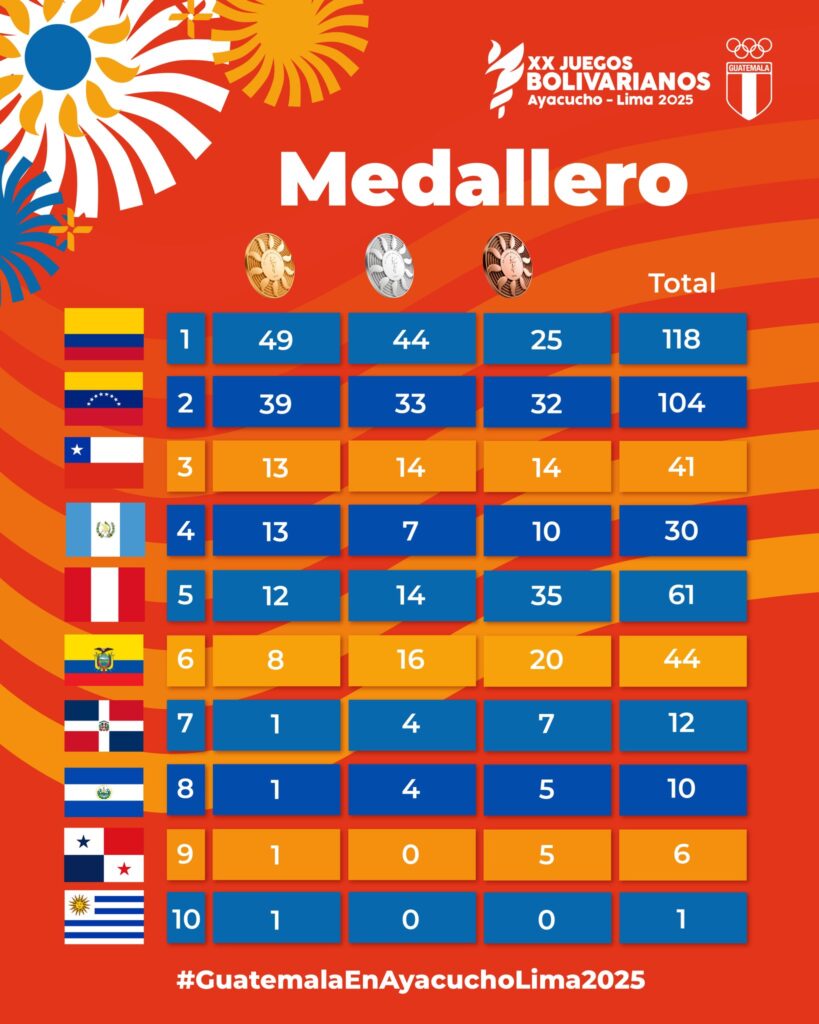 La delegación guatemalteca vive un momento histórico en los Juegos Bolivarianos Ayacucho-Lima 2025. Con una destacada actuación en múltiples disciplinas, Guate se ha consolidado como la única nación centroamericana dentro del top 5 del medallero general, lo que evidencia el alto nivel competitivo de sus atletas en el escenario continental.