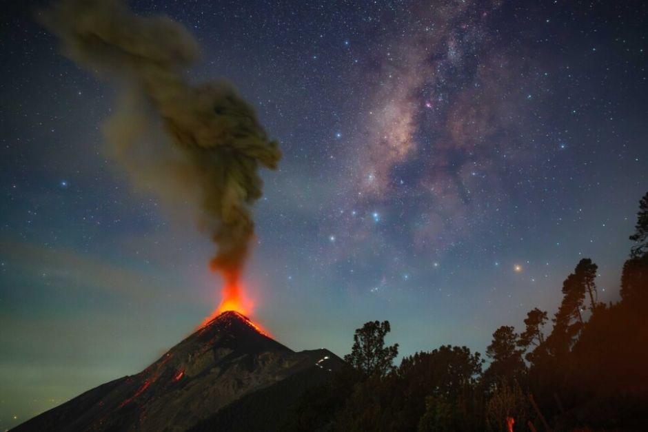 Durante su ascenso, el volcán de Fuego estaba en plena erupción, lo que creó un espectáculo visual único. “La pluma de humo se elevaba justo en el ángulo perfecto con el centro galáctico, creando la ilusión de un rostro terrestre observando la Vía Láctea”, explicó Montúfar.