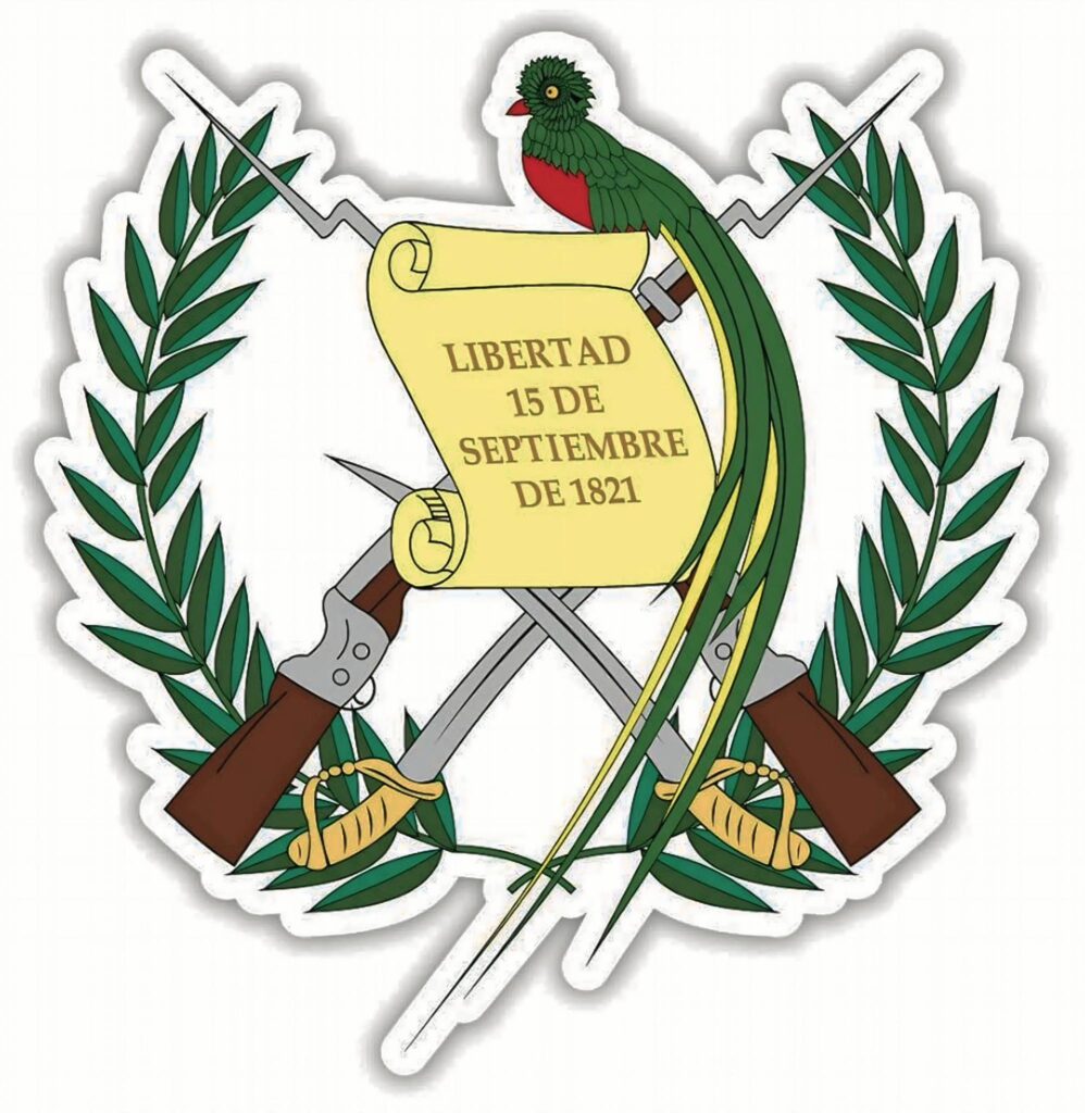 En el decreto se define que llevará dos rifles cruzados, dos espadas doradas y ramas de laurel, sobre un fondo celeste claro, además de un pergamino con la inscripción “Libertad 15 de septiembre de 1821”. En la parte superior aparece un quetzal, símbolo de independencia y autonomía.