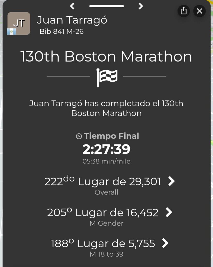 El atleta guatemalteco Juan Fernando Tarragó tuvo una participación destacada en el Maratón de Boston 2026, donde completó la prueba con un tiempo de 2:27:39, en una de las competencias de ruta más exigentes y reconocidas del atletismo internacional.