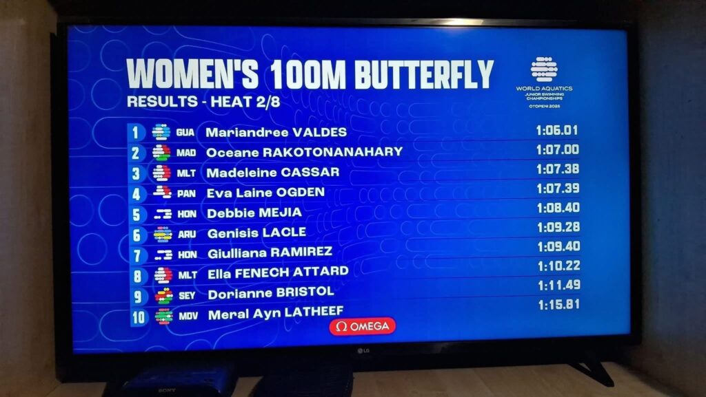La atleta registró un tiempo oficial de 1:06.01, resultado que la posiciona entre las jóvenes promesas de la natación internacional. Su participación marca un paso importante para el deporte acuático guatemalteco, que busca consolidar presencia en torneos mundiales juveniles.