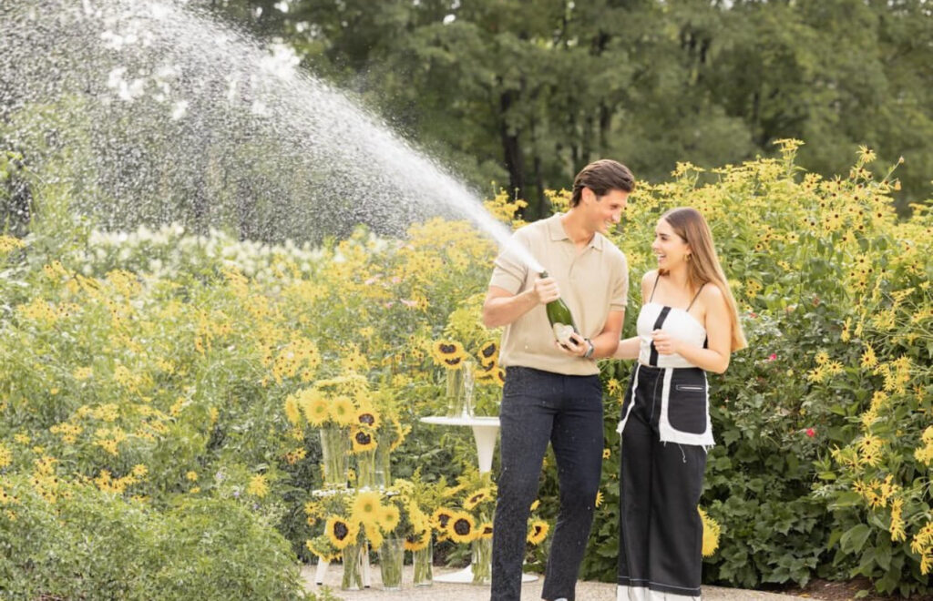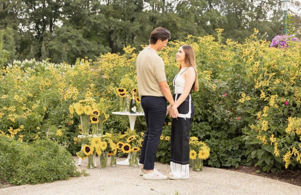 Con un gesto sencillo pero cargado de emoción, Hagen se arrodilló para entregar el anillo, mientras el amarillo de los girasoles enmarcaba la escena como símbolo de alegría y esperanza.