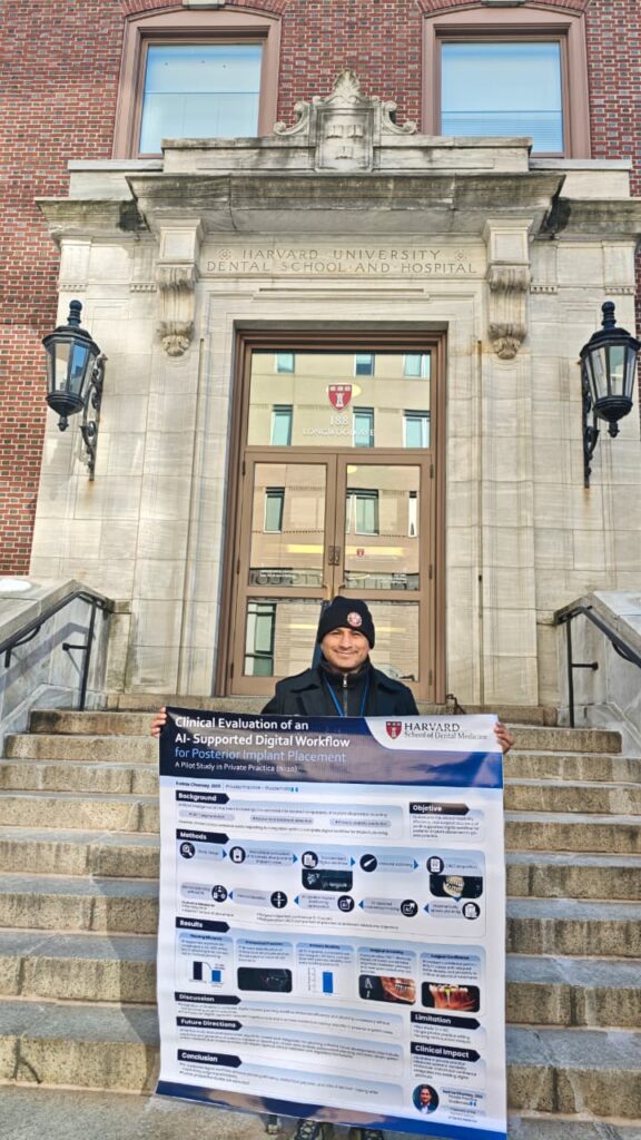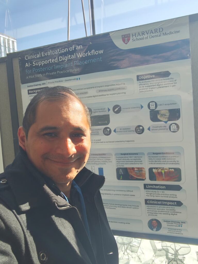 El cirujano dentista guatemalteco, Esdras Isaí Chamay Castro, participó recientemente en un encuentro académico realizado en la Harvard School of Dental Medicine, ubicada en Boston, Massachusetts, Estados Unidos, donde presentó un póster científico durante un simposio enfocado en implantología y odontología digital.