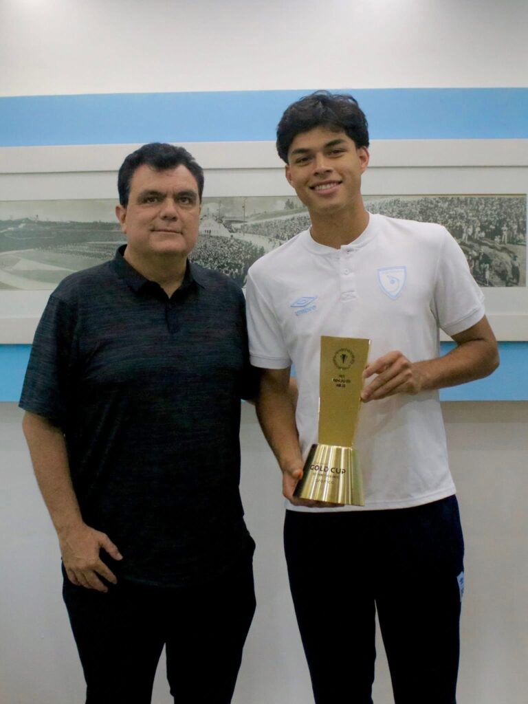 Olger Escobar, quien se perfile como un jugador indispensable en el 11 de Luis Fernando Tena, recibió un galardón por parte de Gerardo Paiz, presidente de la Federación Nacional de Fútbol de Guatemala (Fedefut), luego de su destacada participación en la Copa Oro 2025.