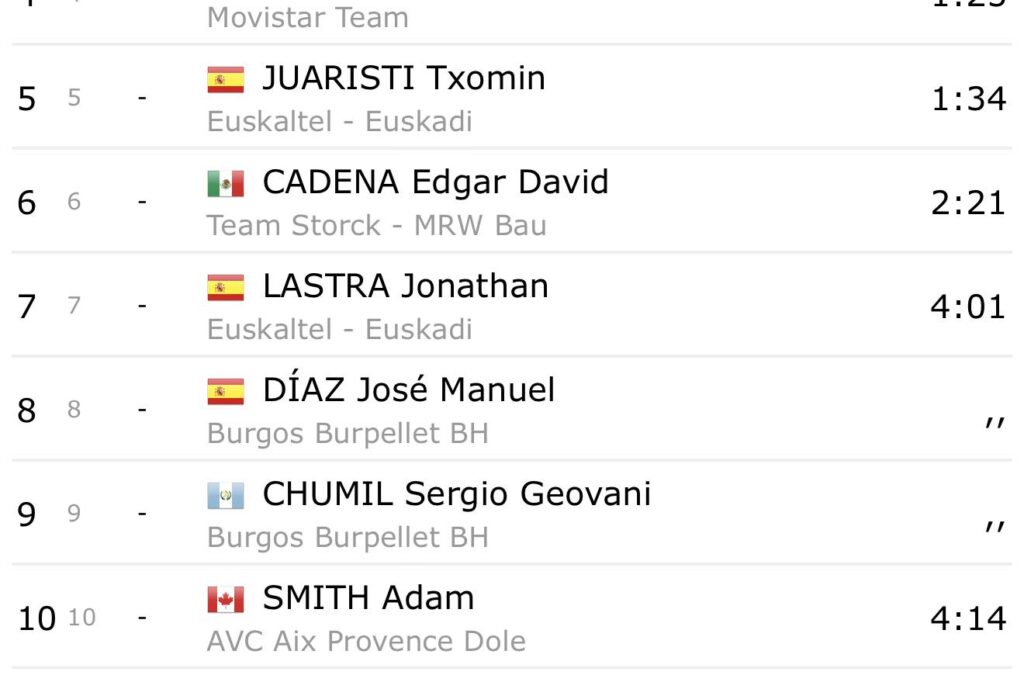Por su parte, el representante guatemalteco finalizó en la posición 14, a tan solo 26 segundos del vencedor, un resultado que refleja su consistencia en una competencia de alto nivel. En la clasificación general, el liderato continúa en manos del colombiano Nairo Quintana, con un tiempo acumulado de 10:50:30.