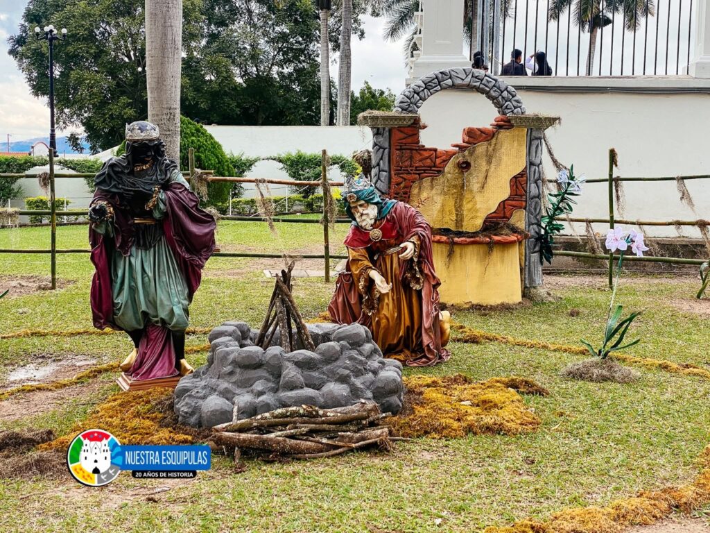 El fondo natural de esta obra es la Basílica de Esquipulas, uno de los referentes espirituales más importantes de Guate. Su presencia arquitectónica acompaña la escena y refuerza el carácter simbólico del nacimiento, integrando tradición religiosa y expresión artística en un mismo espacio.