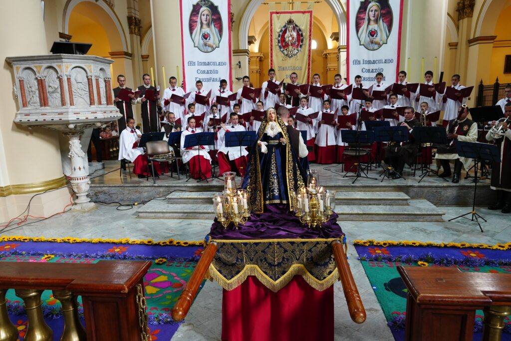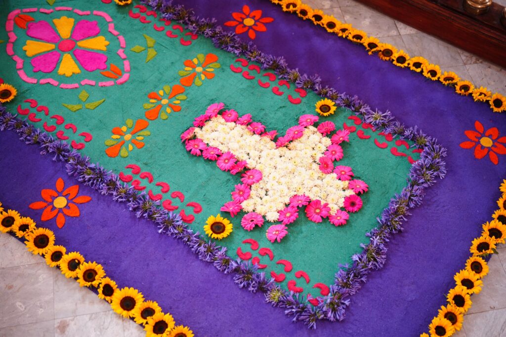La alfombra, elaborada con aserrín teñido, flores y otros materiales naturales, representó un puente de fe y amistad entre Guate y Colombia, invitando a locales, visitantes y miembros del cuerpo diplomático a contemplar una de las expresiones artísticas y espirituales más significativas de la cultura guatemalteca.