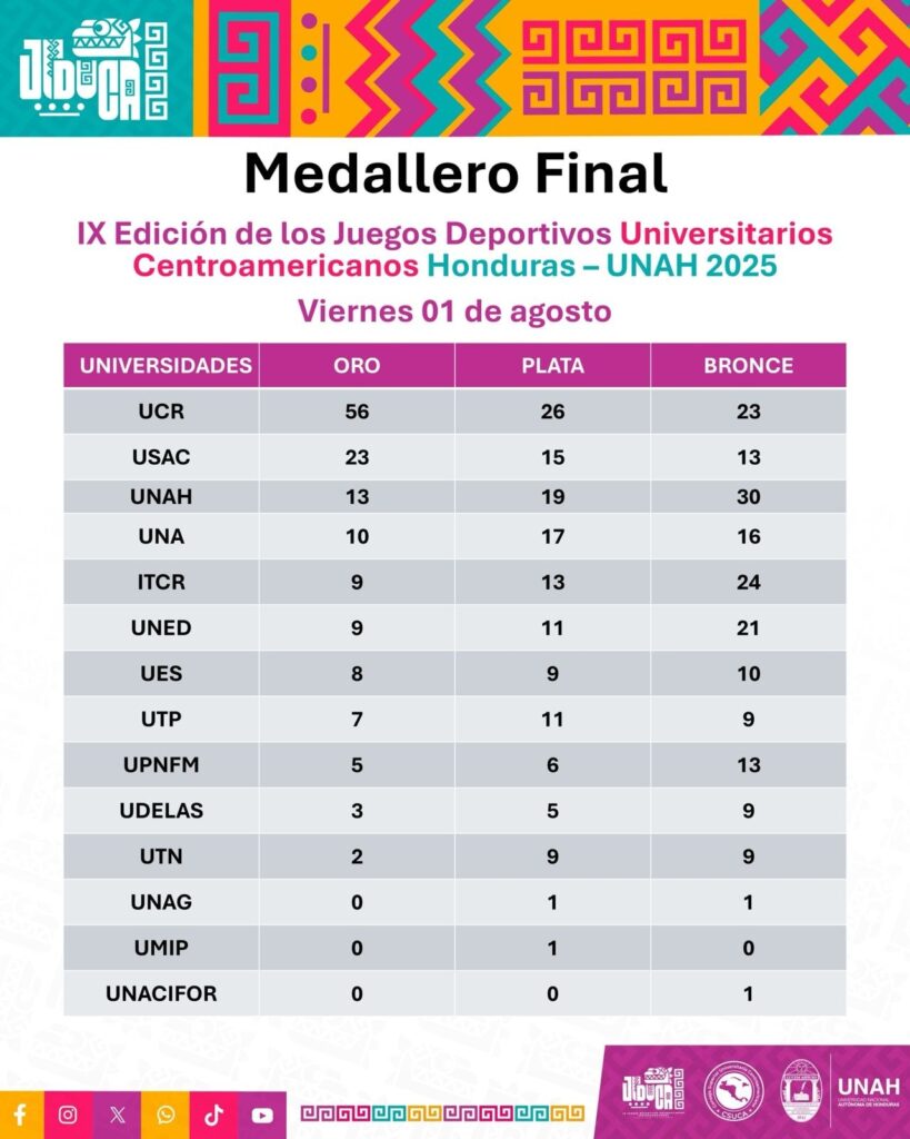Tras cinco días de competencia, la Universidad de San Carlos de Guatemala cerró su participación con un récord histórico. Fue superada únicamente por la Universidad de Costa Rica, que acumuló 105 preseas, de las cuales 56 fueron de oro. La anfitriona, UNAH, finalizó en la tercera posición con 13 oros y 62 medallas en total.